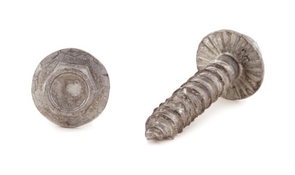 Kraftig träskruv med bricka. Rillor under huvudet biter vid montering mot metall och förhindrar att skruven lossnar. Patenterad gänga med sågande och skärande funktion. Fibercutspets gör det möjligt att montera nära kant utan risk för sprickbildning.