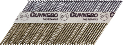 34° Huggen Stomspik med pappbandning för att ge färre omladdningar. Används för att fästa samman virkesdelar i trä, exempelvis träreglar. Läs mer