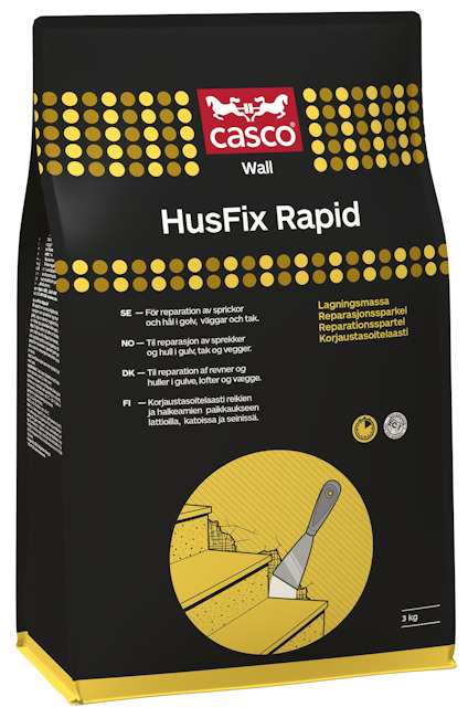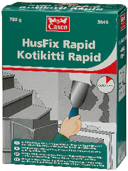HusFix Rapid Casco 3649 För inom- och utomhusbruk. Kortare härdningstid än HusFix 3676. Fäster på de flesta typer av byggnadsmaterial t ex betong, puts, lättbetong, tegel, gips-, träfiberskivor och liknande. Är vit i färgen och passar därmed utmärkt som fästmassa till t ex marmor och glasmosaik. Kan användas i tjocka skikt utan att krympa. Arbetstemperatur: +5°C till +30°C. Användningstid: Ca 45 minuter vid +18°C. Härdar 2 mm på 1 timme. 1 kg pulver ger drygt 0.77 liter färdig massa. Läs säkerhetsdatablad före användning.